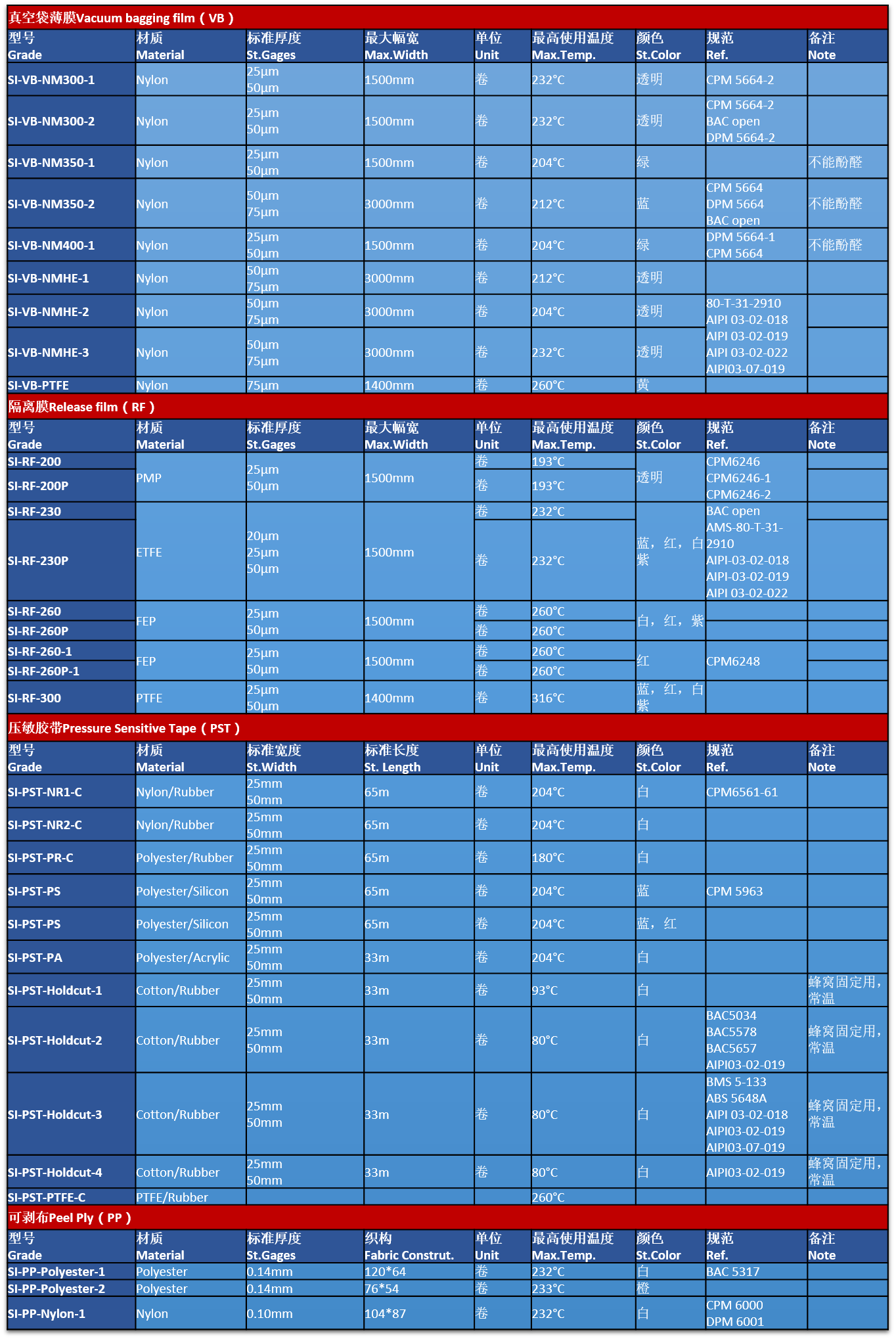 SIBENS is concentrated on high temperature(>180°C) curing process for Autoclave for a long time. The other medium temperature(<150°C) process materials for vacuum bagging operation are also developed. At present, nearly 115 different kinds of process resources have been tested and got feedback. Therefore,SIBENS has built a Qualified-Materials-Catalogue(QMC),Customer could select directly from QMC under certain process conditions.